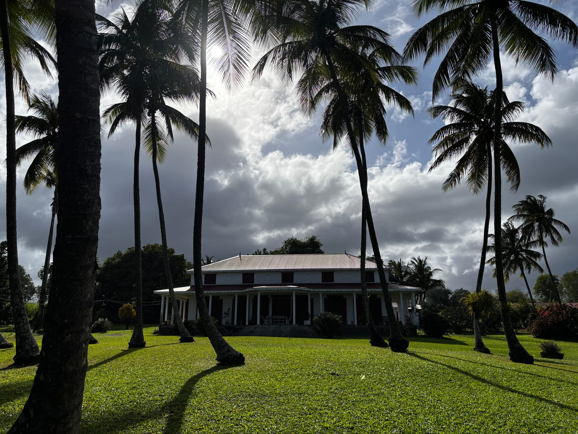 Puis nous allons à la distillerie Longueteau : David nous fait visiter. Nous commencons par la maison coloniale. David nous dit que maison coloniale vient du fait que la maison a des colonnes et que ce n'est pas en réalité "les colonies" après je regarde sur internet. Il semble que ce soit la culture populaire qui indique que les maisons coloniales ont des colonnes alors qu'en réalité il s'agit bien des colonies et du passé colonial durant lequel les colons avaient tendance à créer des maisons bien adaptées au climat avec une avancée tout autour de la maison.