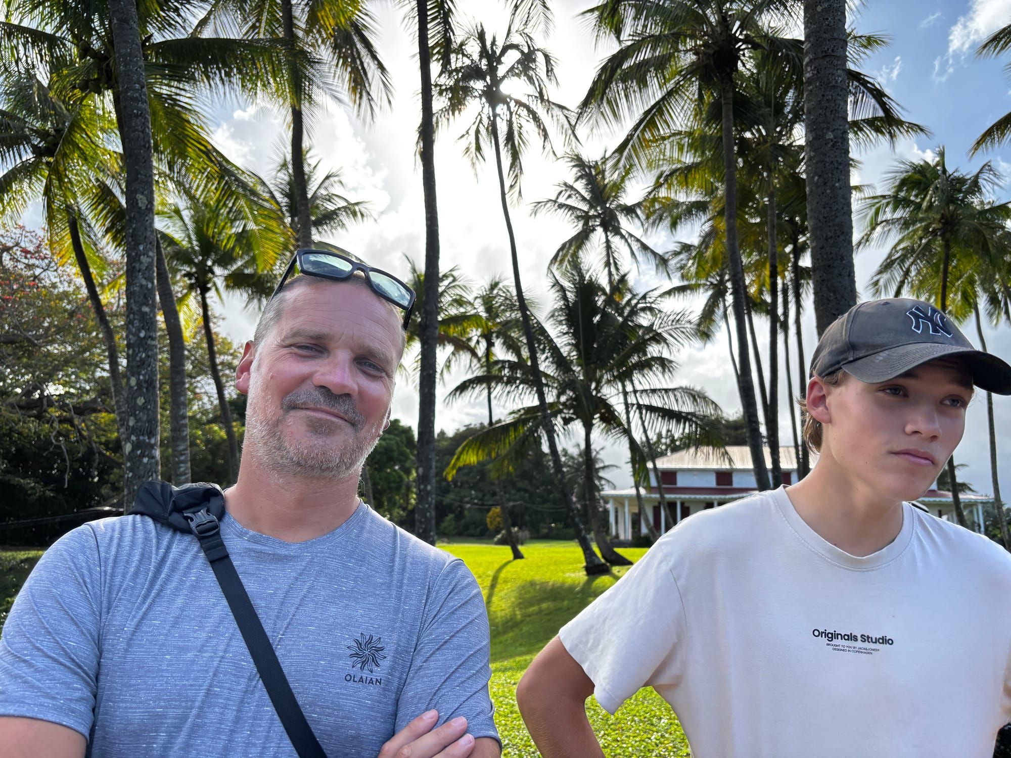 Le 10 mars nous avons rendez-vous à 10h30 à la plantation grand café. Ancienne plantation de café elle est désormais spécialisé dans la banane et un peu la vanille. Nous arrivons vraiment chez l'agriculteur ils sont adorables cela fait 33 ans qu'ils reçoivent du public on est vraiment dans la ferme et le propriétaire semble très heureux d'être là il nous explique plein de choses et nous fait des blagues constamment c'est assez rigolo. En voilà un qui est heureux de vivre ! Finalement la présenter il l'a fait presque plus à lui qu'à nous car il s'amuse de ses blagues.