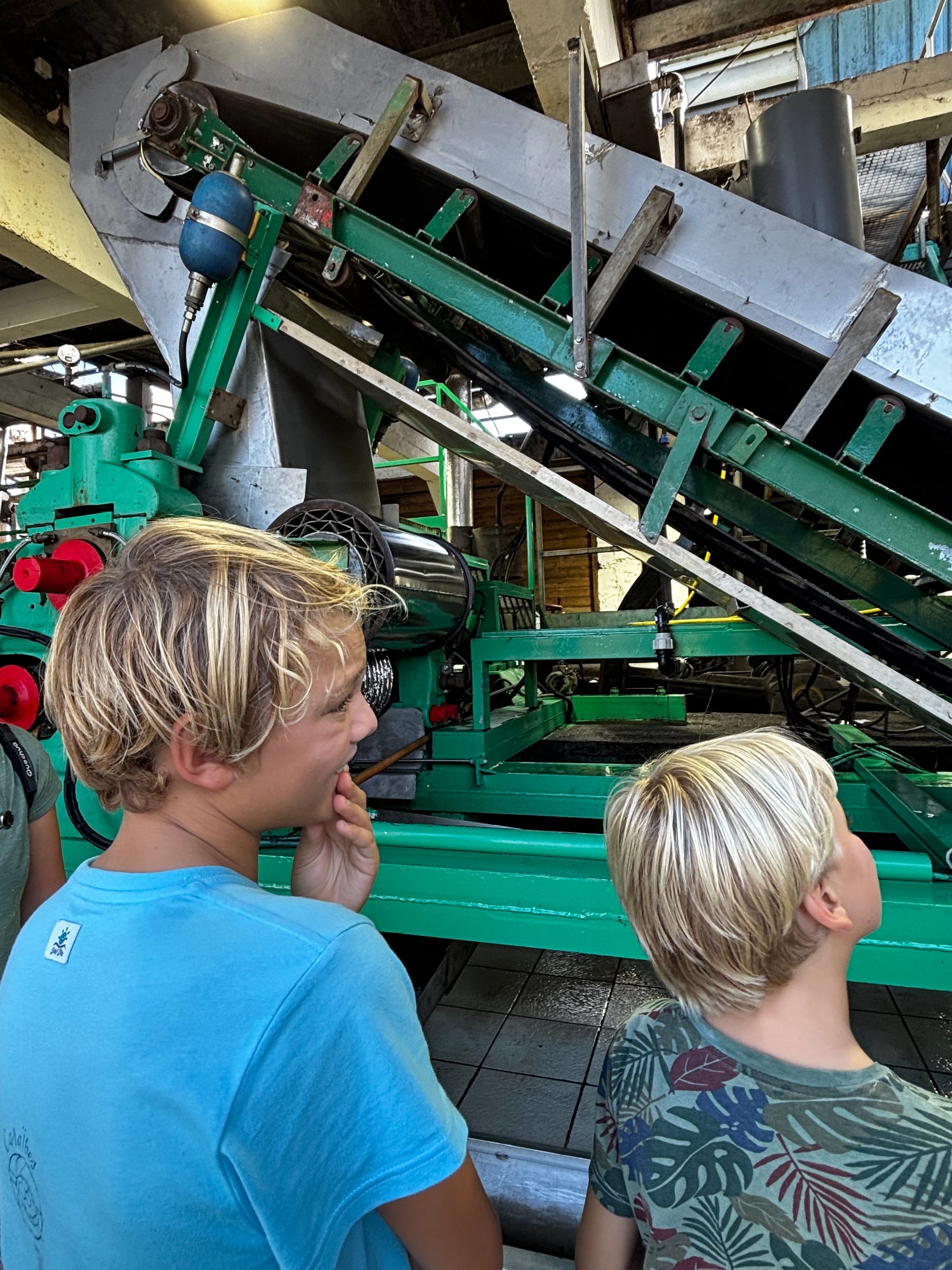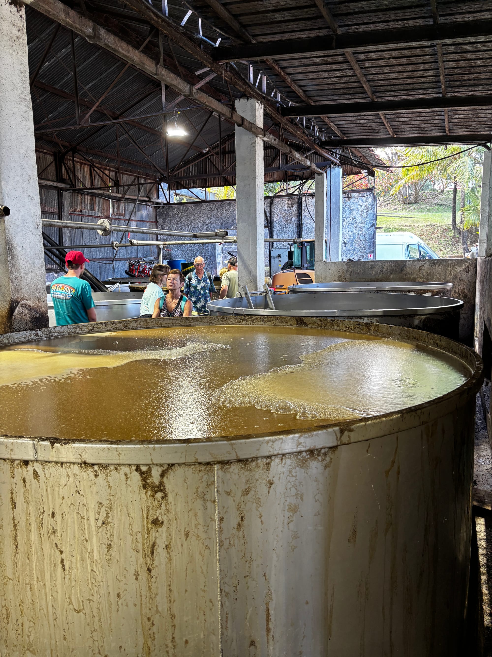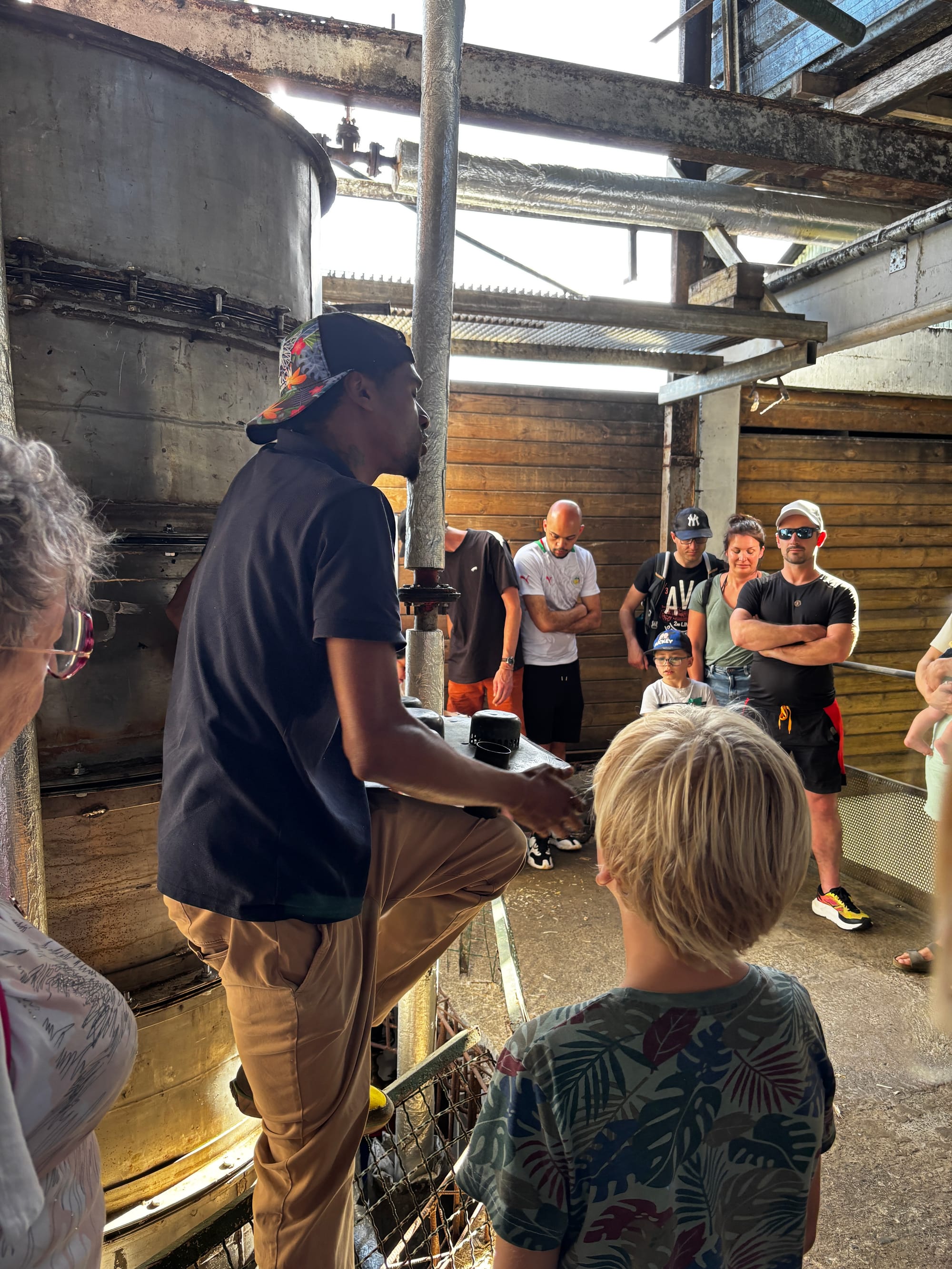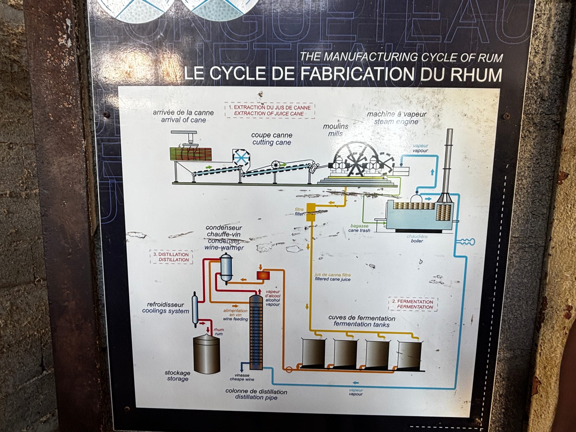 Il nous explique tout le processus de fabrication, nous voyons les plantations, l'extraction du jus, les grandes cuves de fermentation, la distillation, le vieillissement en chai. Il nous explique que la distillerie Longueteau fait partie des rares distilleries dans le monde à assurer tout le processus de la plantation à l'embouteillage. Beaucoup sont en réalité des rhumeries et vont chercher leurs rhums et alcools ailleurs (Marie Galante, Montebello) et font des assemblages/mélanges (Don papa ou Fon Barcelo). Les distilleries Bielle et Damoiseau sont aussi producteurs (Damoiseau serait plus neutre en goût).