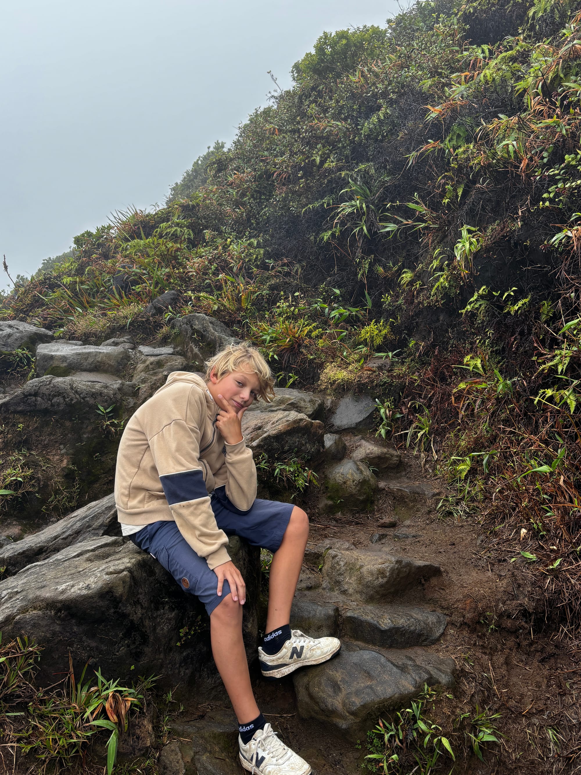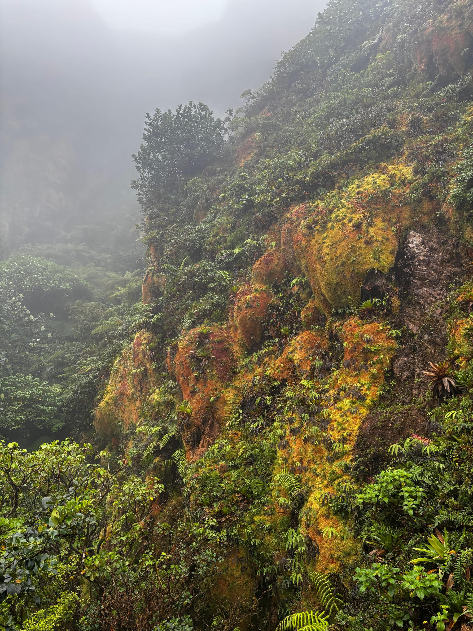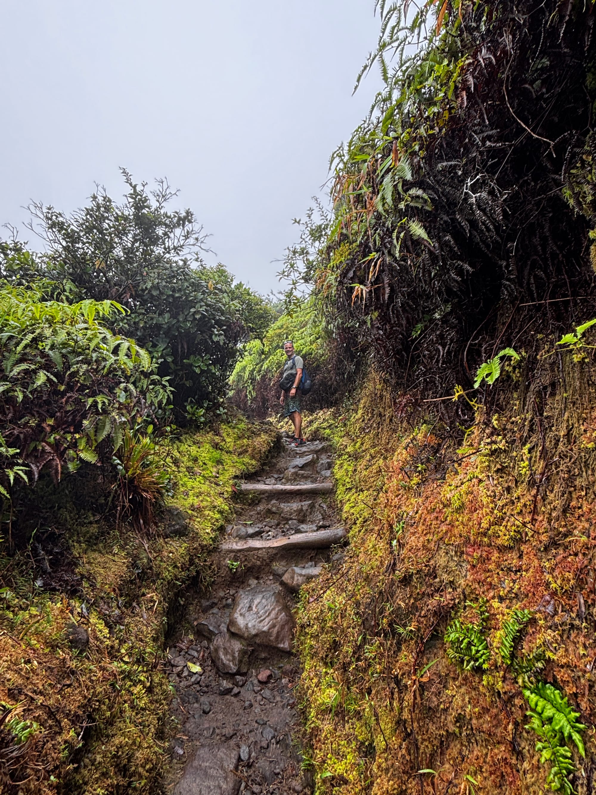 On se lève très tôt pour partir faire la rando de La Soufrière. Nous arrivons sur place vers 08h00. Le Chemin des Dames est l'itinéraire que l'on prend pour atteindre le sommet de la Soufrière à 1467m. Accessible depuis les Bains Jaunes, ce parcours balisé de 6,4 km aller-retour traverse une végétation luxuriante avant d'arriver aux fumerolles.