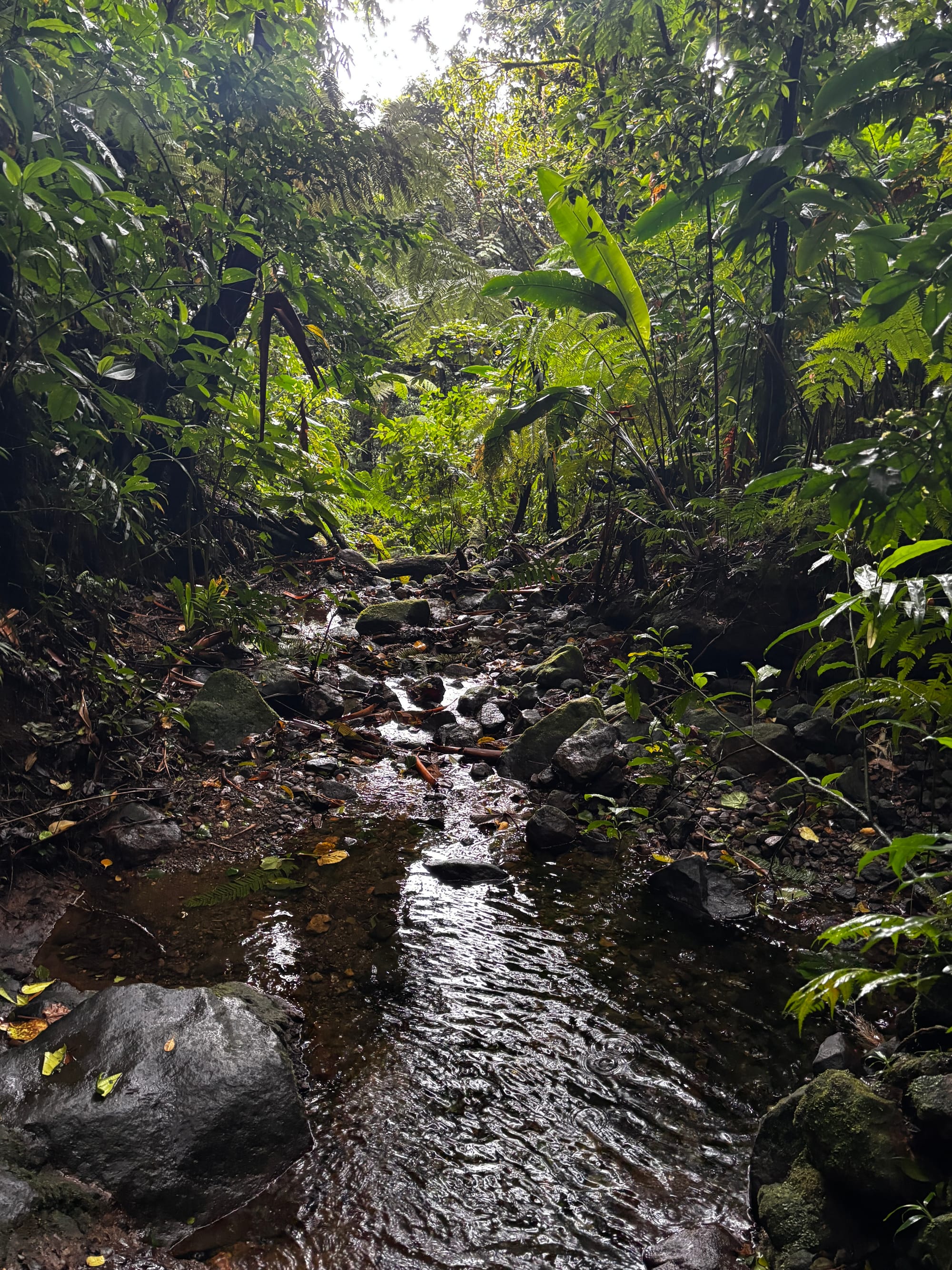 Le premier jour nous avons une voiture. Nous essayons les chutes du Carbet, malheureusement en arrivant aux chutes, il pleut très fort et nous décidons de revenir à un autre moment. Nous choisissons d'aller au "cascades des Bains Bleus", Marche agréable mais comme il pleut beaucoup les bains ne sont pas bleus, ils sont marrons ce n'est pas grave sur le côté il y a une petite corde et les enfants montent pour voir une autre cascade plus haut.