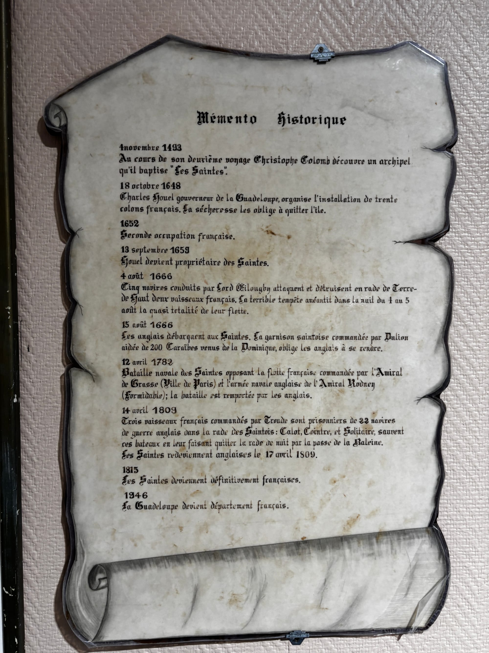 On y apprend que le fort Napoléon succède à un fort anglais détruit en 1809 par les français. Comme sur chaque île des Caraïbes, les français et les anglais se sont entretués pour obtenir la propriété des îles. Après avoir détruit le fort, les français l'ont donc reconstruit, il aura fallu beaucoup de temps! Si bien que le fort n'aura JAMAIS servi à des fins militaires, plutôt comme prison politique pendant 20 ans... Le fort n'a jamais reçu la visite de Napoléon.